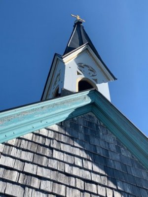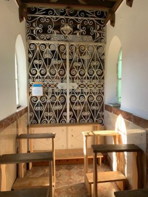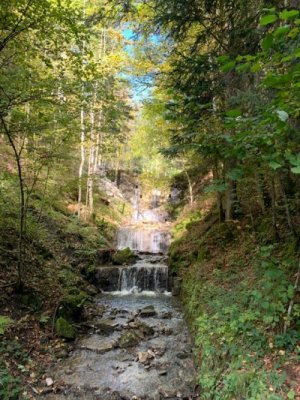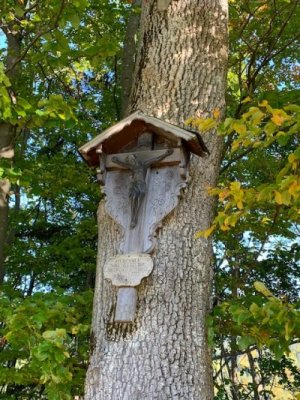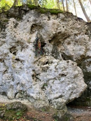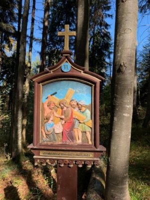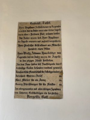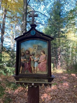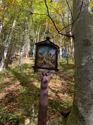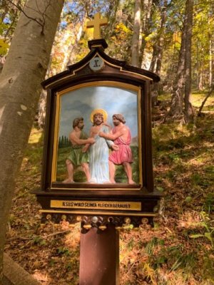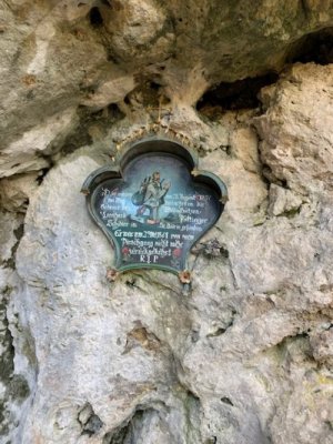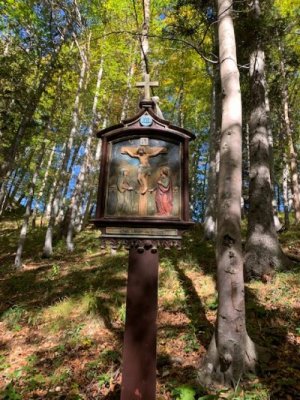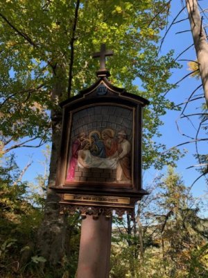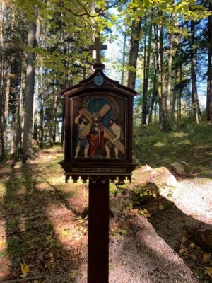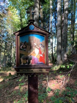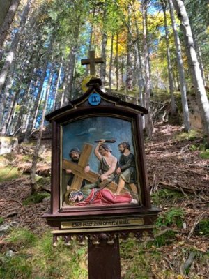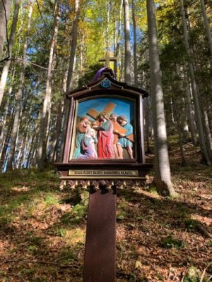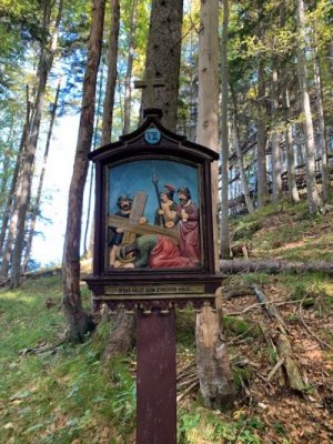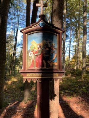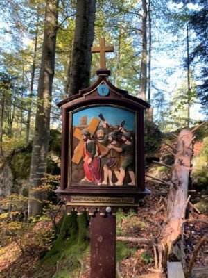 Bevor wir aber zur Kapelle gelangten, begann kurz nach dem Berggasthof der Kreuzweg. Auf 14 Tafeln, also den Stationen der Kreuzigung, und mehr als 500 Holztreppen-Stufen wird hier der Leidensweg Christi aufgezeigt. Einfach wunderschön. Vorbei kamen wir auf unserem Weg nach oben an einer Grotte. Hier wurden beim Bau des Kreuzwegs die Gebeine eines 1861 verschwundenen Wilderers, Leonhard Pöttinger, gefunden. Eine Gedenktafel erinnert an ihn.