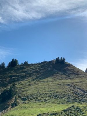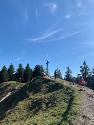 Von der Kapelle aus ging es noch einmal cirka eine Stunde weiter hoch auf die Baumgartenschneid. Dies ist der Gipfel neben dem Riederstein. Der Blick ist noch einmal gigantischer und wir waren wirklich dem Himmel ein Stück nahe. Wir hatten an diesem Tag eine herrliche Fernsicht, schauten bis zum Karwendel und noch weiter. Einfach traumhaft.