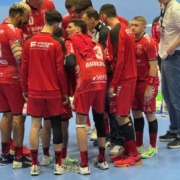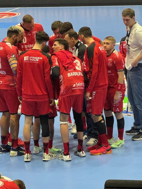 MT-Trainer Roberto Garcia Parrondo standen inklusive Danner nur elf Feldspieler zur Verfügung. Als dann nach cirka 20 Minuten Adrian Sipos den roten Karton aufgrund eines Foulspiels sah, wurde es wirklich eng. Aber die restliche Mannschaft kämpfte, war beweglich, stand gut in der Abwehr und legte ein enormes Tempo an den Tag. 4:0 stand es nach fünf Spielminuten. Doch die Gäste hatten sich gefangen und das “Hochgeschwindigkeits-“Spiel wurde körperbetont und ausgeglichen. 5:5 stand es nach 15 Minuten, 9:7 nach 19. Dann wurde es hektisch auf dem Parkett und innerhalb weniger Minuten sah Adrian Sipos auf der einen und Moritz Preuss auf der anderen Seite rot. Die Gemüter beruhigten sich wieder und die Gastgeber gingen mit 17:12 in die Pause.